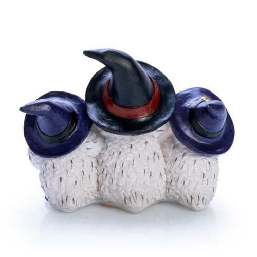 Playful family of snowy owls wearing witches hats. Feather texture and black fleck details look just like the real animal. Made from sturdy polyresin with a luxurious, weighty feel.