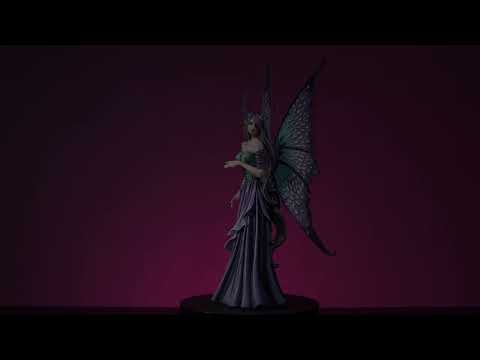 Figurine of an elegant purple fairy gazing lovingly at a baby dragon. She wears a corset adorned with feathers and a flowing purple dress to match her glittery purple wings. Detailed sculpting and paintwork with lifelike textures.