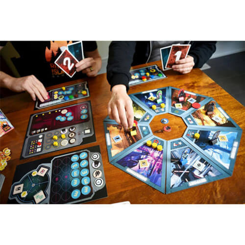 In Too Deep provides a unique narrative that thrusts you into the future in a tense, strategic board game for 1-5 players. Draft characters and spend actions to complete objectives and collect sets. What side of the law will you end up on?