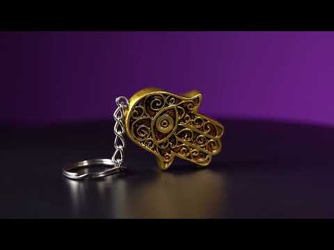 Mystical hand-painted hamsa hand keychain. Features intricate hamsa design with a metallic finish on a traditional keychain ring.