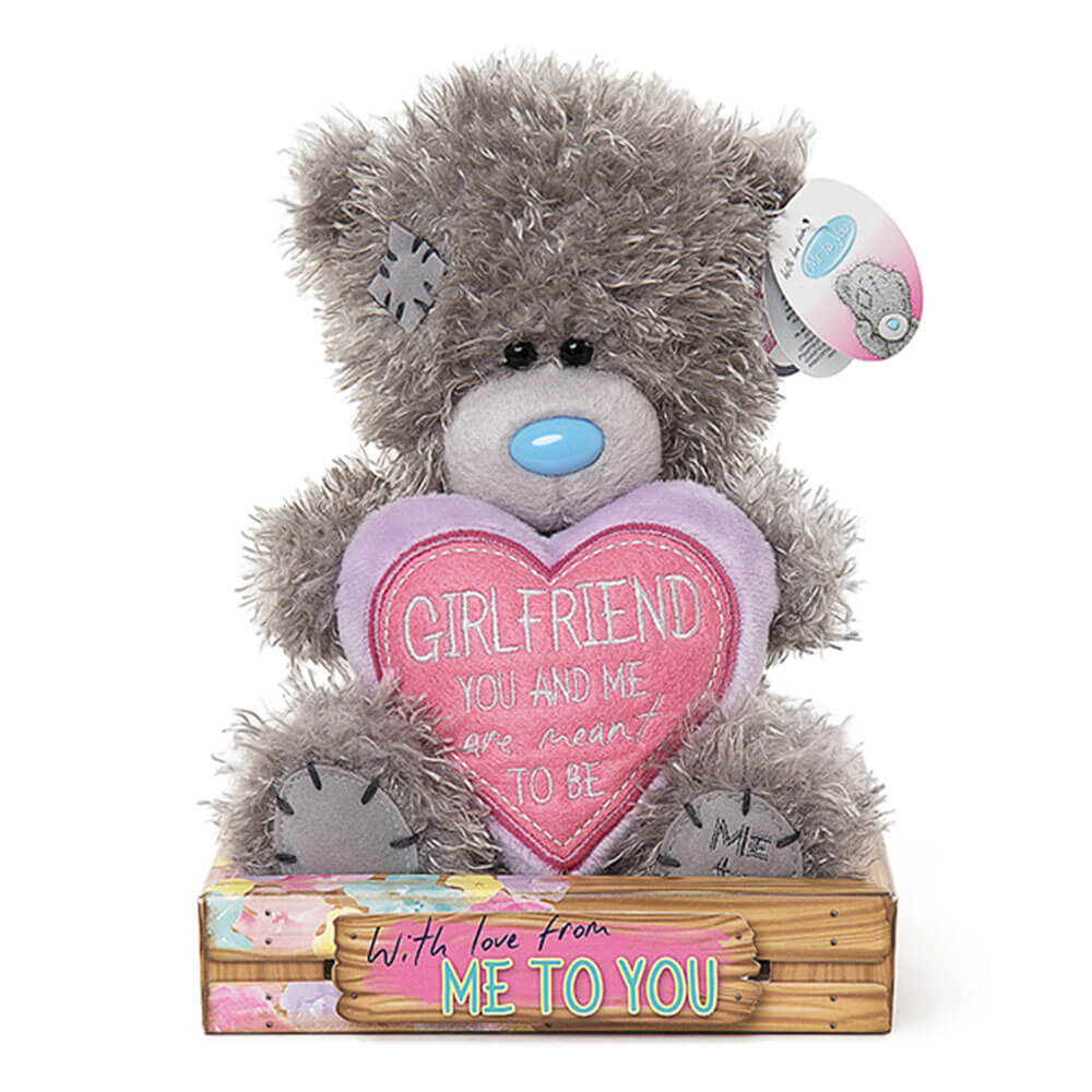 • 15cm plush teddy with cushion heart * Message reads “Girlfriend, you and me are meant to be” *