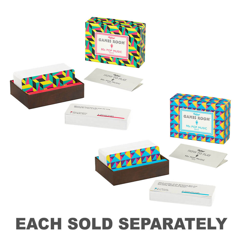 - Features 140 multiple choice question cards presented in a 90s-inspired geometric box.