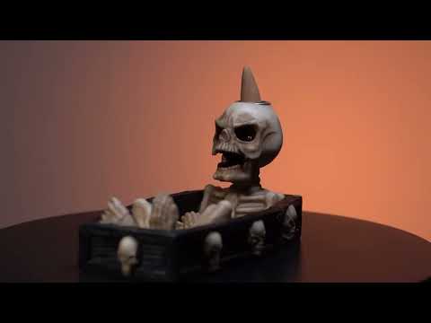 Mysterious incense burner shaped like a skeleton sitting inside a coffin. Place a lit incense cone on the skeletons head to see smoke flow out through its mouth. Suitable for both incense sticks or cones.