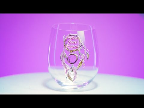 - Hand-blown stemless wine glass featuring a whimsical dreamcatcher "Follow Your Dreams".