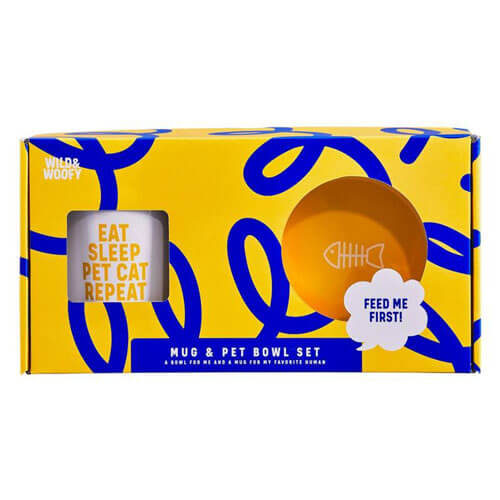 A gift for me and a gift for my favourite human! This Cat Mug and Bowl Set from Wild and Woofy is the perfect gift for that inseparable human and cat duo. Ceramic Mug and Stoneware Bowl Cat Gift Set. Mug reads 'Eat Sleep Pet Cat Repeat' and the bowl reads 'Feed Me First'. Packaged in orange box with blue spring print.